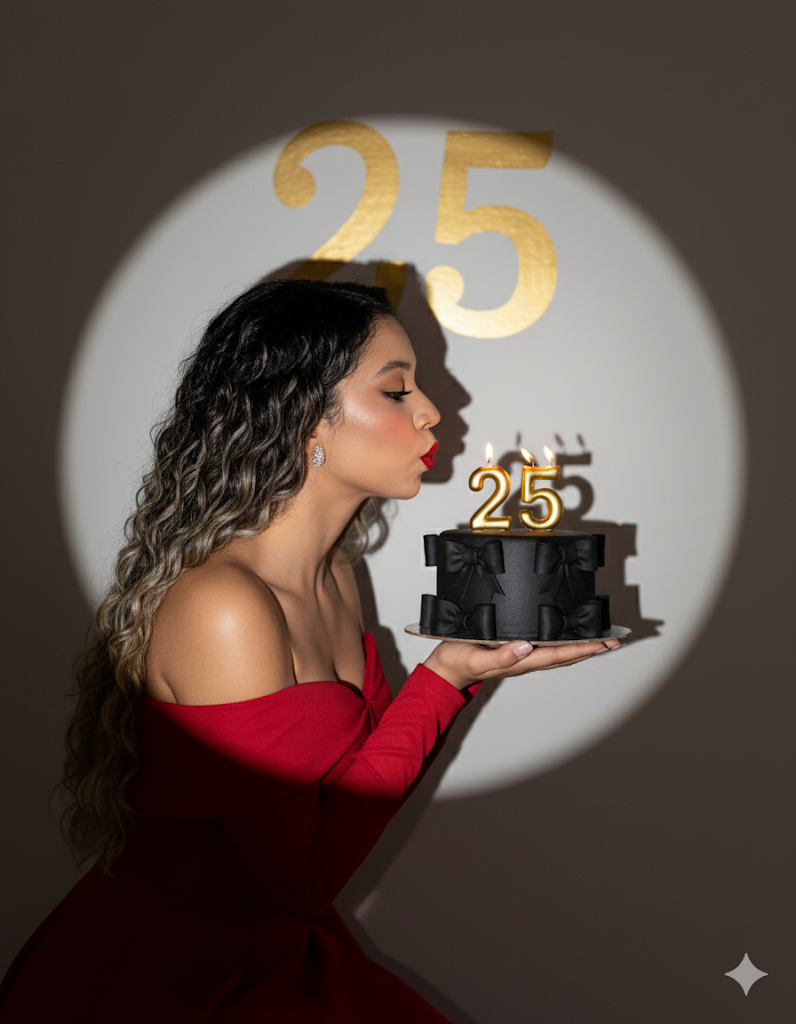 Crie um retrato glamouroso para uma sessão de fotos de aniversário com flash. O fundo é uma parede neutra e simples iluminada por um holofote redondo, projetando uma sombra nítida e dramática atrás de mim, para um efeito cinematográfico. Estou de perfil, inclinada ligeiramente para a frente, como se estivesse soprando uma vela de um bolo preto com laços que seguro delicadamente com as duas mãos. O bolo está coberto de velas acesas de número 28 e há número 28 na parede.