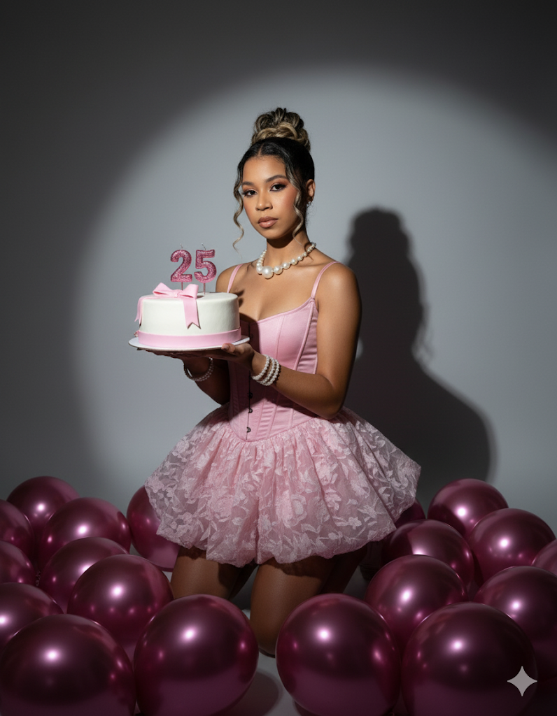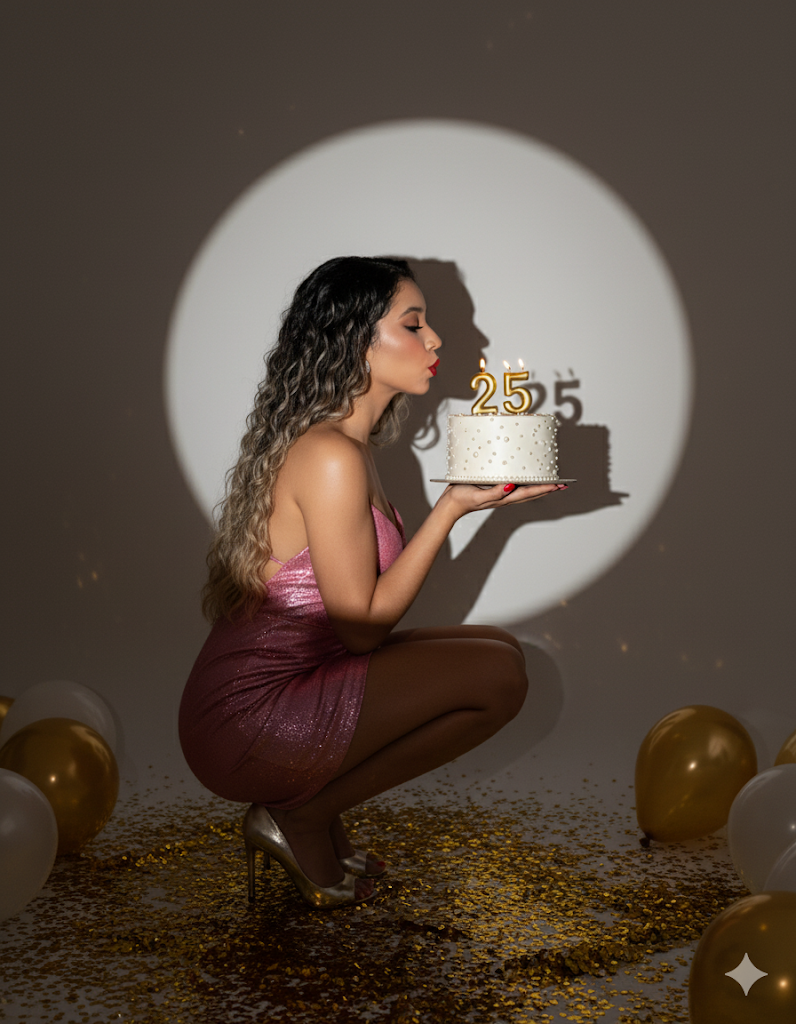 Esse é o meu rosto e meu corpo.Crie um retrato glamoroso para uma sessão de aniversário onde estou agachada, usando um vestido rosa de cetim brilhoso, curto e com as costas parcialmente a mostra. Mantenha os traços originais do meu rosto. E crie a foto sem o óculos. Nos pés, salto dourado.Em minhas mãos, seguro um bolo branco decorado com pequenas pérolas e velas em formato do número 25 O cenario apresenta uma parede lisa e neutra, iluminada por uma luz circular dramática, projetando a sombra de mim e do bolo ao fundo.Meu cabelo bem loiro com luzes está solto, le na altura da metade das costas unhas vermelha. Ao redor da cena, balões dourados e brancos completam a atmosfera festiva, o chão deverá estar cheio de glitter dourado.