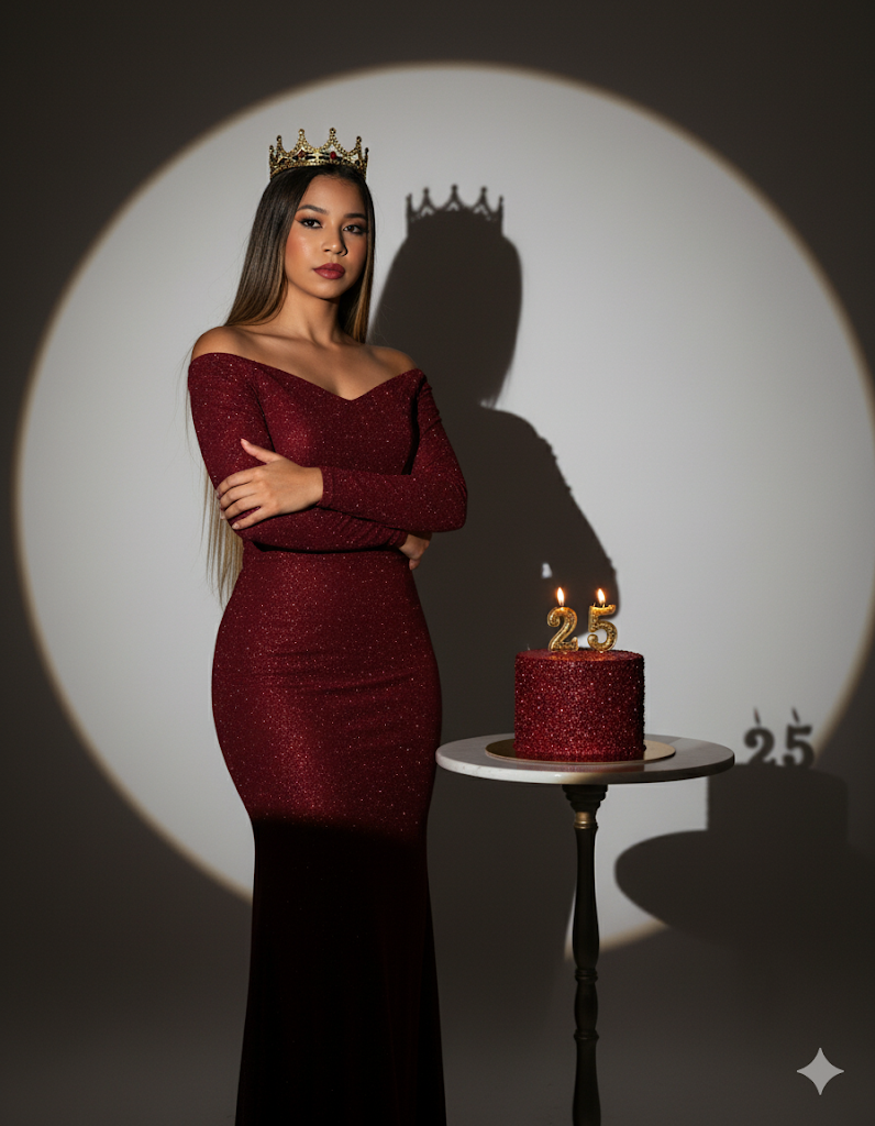 Crie um retrato glamoroso para uma sessão de fotos de aniversário com um brilho no meu rosto. O cenário apresenta uma parede neutra e simples, iluminada por um holofote circular dramático que projeta uma sombra ousada atrás de mim, realçando o clima cinematográfico. Estou em pé ao lado de uma elegante mesa de pedestal, com um braço cruzado sobre o tronco enquanto o outro repousa elegantemente, em uma pose poderosa. Sobre a mesa, está um bolo rico e único, cor de vinho, coberto com glitter cor de vinho, coberto com velas brilhantes número “21”. Sua luz quente adiciona um toque festivo. Uso um vestido vinho longo, brilhante e justo, com sutis detalhes de glitter que brilham sob os holofotes, criando uma vibe luxuosa e editorial. Uma coroa dourada repousa elegantemente na minha cabeça, enfatizando a estética de rainha do aniversário, enquanto meu cabelo longo e liso cai em cascata sobre meus ombros. Minha expressão exala confiança e força, com meu tronco ligeiramente voltado para o bolo.