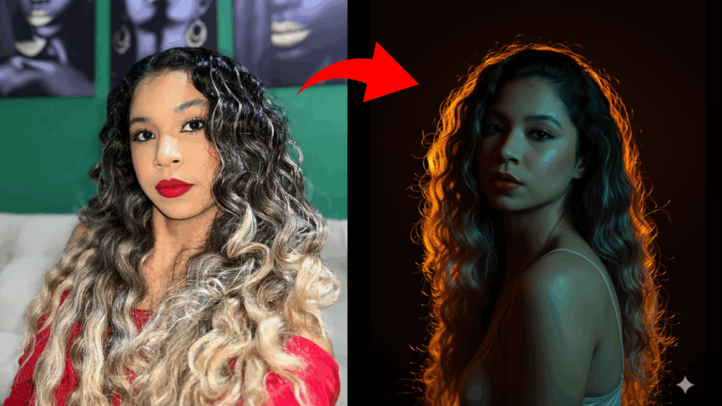 Uma fonte secundária fria (luz azul/verde) ilumina o rostro e parte do ombro, criando um contraste de cores complementares (cálido no cabelo, frio na pele).